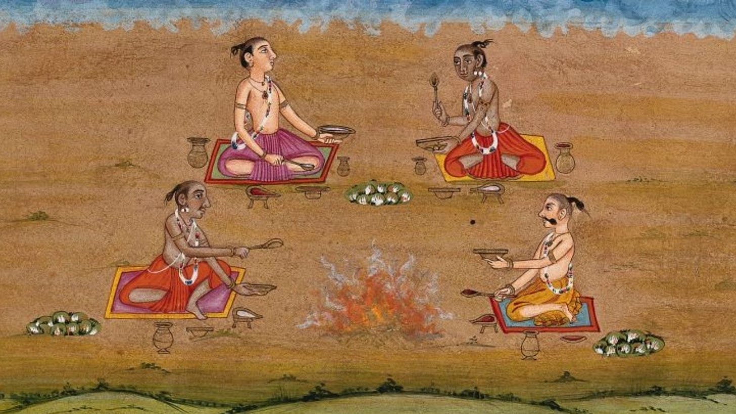 Four priests perform a yagna, a fire sacrifice, an old vedic ritual where offerings are made to the god of fire, Agni. Gouache painting by an Indian artist. Wellcome Collection. Source: Wellcome Collection. Date:[between 1800 and 1899?]