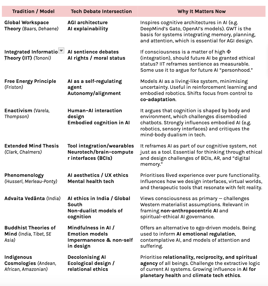 Each framework presents different attributes — from attention and memory, to embodiment, to spiritual or ecological awareness — shaping how we think about machine intelligence, ethical design, and the future of AI.